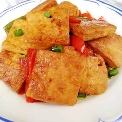 2.Wash the old tofu, cut the tofu into slices, heat the oil in a pan and fry the tofu over low heat until both sides are golden and set aside.