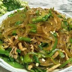 6.Pour the green pepper into the pot and stir-fry until green Soften the pepper, pour the soaked vermicelli into the pot and stir-fry twice