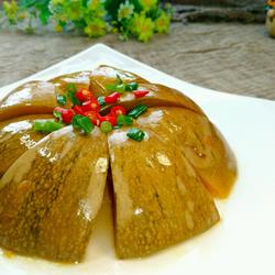 4.The pumpkin is placed in a soup bowl whose internal space is about the same size as the pumpkin used (the soup bowl regulates the finished product shape), Enlarge pumpkin pieces on the outside, stuff small pumpkin pieces in the middle for fixation, pour in the fresh soup, slightly cover the pumpkin pieces, and steam over high heat for 30 minutes