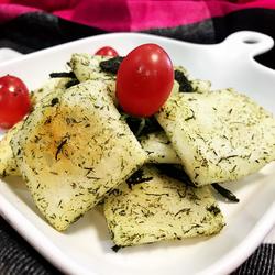 There should be no moisture on the surface of the rice cakes, otherwise the oil will splash.The moss strips must be fried with the residual heat of the oil, otherwise they will become burnt! Because the moss strips are salty and there is no seasoning, you can add sugar if you like.