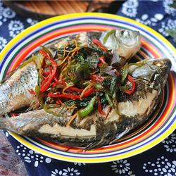 7.After steaming, there will be a lot of soup in the dish.Pour out the soup and remove the perilla stems from under the fish