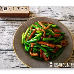 7. The shredded pork has almost absorbed the soy sauce.Immediately add garlic moss and stir-fry over medium-high heat..(If the pot is not heavy, if you stir it a few times, there will be sparks like street stir-fry, and the dish will have a bit of "fire flavor".)
