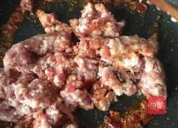 3. Pour in the minced meat and stir-fry, add peppercorns, cooking wine, light soy sauce, dark soy sauce, salt, sugar and chicken essence condiments
