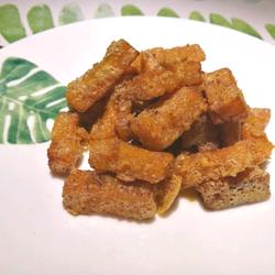 5.After frying the pumpkin, take it out, add a little oil, put the crushed egg yolk and a little sugar into the pot, stir-fry until foaming, quickly add the pumpkin strips, stir and it's ready to serve