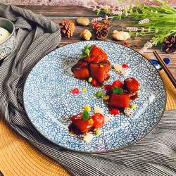 23.Place the braised pork on a plate and garnish with fresh fruits and flowers