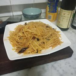 2. Pour in the shredded potatoes, add salt, sugar, MSG, white soy sauce and stir-fry them until raw