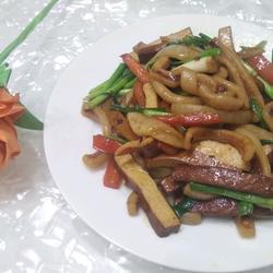 3. Cut the cooked squid into shreds, cut the dried tofu into shreds, cut the garlic into sections with a diagonal knife, cut the pepper into shreds, cut the root of the leek into sections, and cut the ginger into shreds