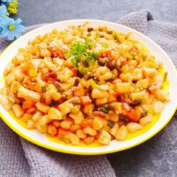 9.Saute until the onions turn slightly yellow, add diced carrots and garlic sprouts, add salt, and stir-fry until the carrots and garlic sprouts become soft