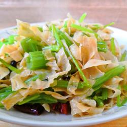 7. After the celery is fragrant, add the tofu skin and stir-fry evenly.