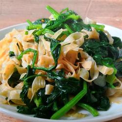 7. After the spinach is soft, add the tofu skin and stir-fry evenly.