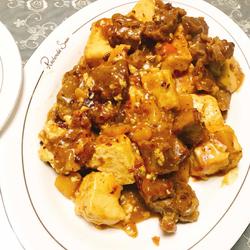 3.Put in the old tofu and fry for a while, then add the beef cubes and stir-fry, and add a large bag of dream curry.Then pour water to cover the ingredients, add a small spoon each of seasonings, sugar, salt, and chicken essence.Cook over high heat until the juice is almost gone.Complete