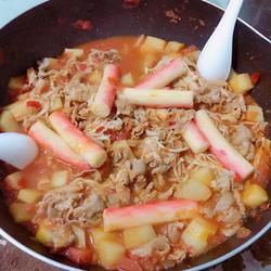 6. Stir-fry the juice and add water.After boiling, put the potatoes and tomato cubes in (I put enoki mushrooms and crab sticks, you can change them to what you like).Finally, add meat and beef.Lamb rolls are fine
