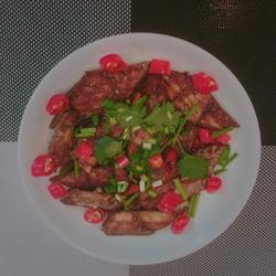 5.Add the hairtail, add a little bay leaves, cook evenly over medium heat, and dilute it to the soup.Add a little vinegar, pour in red pepper, millet pepper, and a little dark soy sauce, cook until the soup base slowly melts, turn to a slightly higher heat to reduce the juice.Remove the star anise and bay leaves and discard them.Sprinkle a few slices of coriander and chopped green onion on the plate!