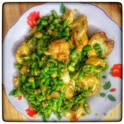 6.Put them into bubbles in sequence Green chili pepper, garlic, then add garlic moss, stir-fry, add appropriate amount of salt, add appropriate amount of soy sauce