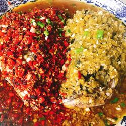 4. After the two kinds of fish heads are cooked, drain off the excess water and put them on a plate.Sprinkle with chopped green onion, pour hot oil on top, and serve.