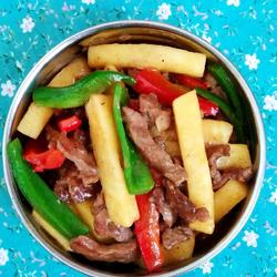 5. Heat the remaining base oil in the pot, add shredded beef, apple strips, and peppers Pour in the shreds together, add tomato sauce, salt, shredded ginger, stir-fry evenly until the peppers are broken, add chicken essence and take it out of the pot.