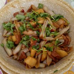 1. Wash the beans, shred the potatoes and cut into pieces.Cut the fat and lean meat into pieces.Cut the onions, ginger and garlic into pieces.Good for backup