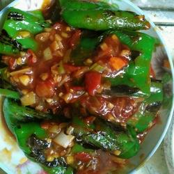 7. When the green peppers are fried until soft but not completely soft, you can turn off the heat and serve.A plate of braised sweet and spicy, spicy and sweet braise The tiger skin green pepper is done!
