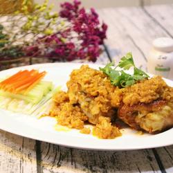 15. Pour shredded coconut sauce on the chicken legs and garnish with cucumber, green onion and pepper.