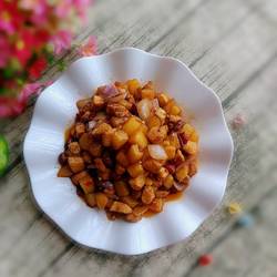 9. Add diced chicken and potatoes, stir-fry, and add light soy sauce and soy sauce.