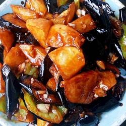 2. Heat the oil and fry the potatoes until golden, then fry the eggplants to the same golden color.Remove and set aside