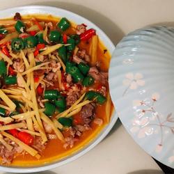 2. Cut green pepper and millet pepper into sections, and shred the ginger.(Zigong cuisine must have a lot of ginger)