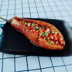 3. Cut the eggplant out of the oven with a knife in the middle , be careful not to scratch