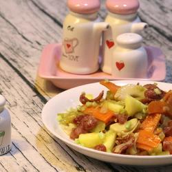 5.Add sausage slices and stir-fry.When oil seeps slightly, add carrots.