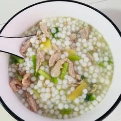 5. Add the bead powder and lean mushroom meat to the pot and stir-fry for a minute or two.Add water and bring to a boil.Add celery, onion, ginger, garlic, etc., fragrant.The lean meat pearl powder would be great!
