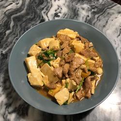 1. Prepare the ingredients first, cut the tofu into pieces according to personal preference, and then marinate the meat for about 10 minutes (use ginger, garlic, soy sauce, oil, salt, sugar, corn flour , cooking wine), sauce (water, oil, soy sauce, corn flour, cooking wine) and set aside.