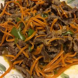 9. Stir-fry until it is about 70-80% cooked, then add oil and stir-fry the beef.When the beef is 70%-80% cooked, add the carrots and green pepper shreds you just fried and stir-fry together for a while.Remove the juice over high heat, remove from the pot and serve on a plate