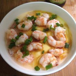 7.After five minutes, remove the plastic wrap and leave it Add the shrimp, cover with plastic wrap and continue steaming for 5 minutes