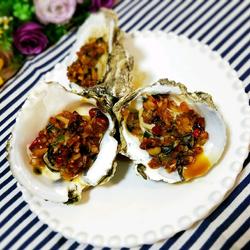 6.Pour the sauteed minced garlic on the oysters, and preheat the oven to 220 degrees