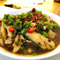 3.Put a little oil in the pot over low heat, add Sichuan peppercorns, vine peppers, minced garlic, and minced ginger and stir-fry When the aroma comes out, add two kinds of chili peppers, soy sauce, an appropriate amount of chicken wing soup, a little sugar, vinegar, and finally add green onions and vine pepper oil to complete the sauce seasoning