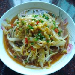 6.Pour the steamed baby cabbage soup into the pot, thicken it with water starch, and add some Chopped green onion, stir together to make it sticky