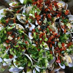 3.Put water in the pot, add a little ginger and perilla, bring to a boil, then add the scallops and cook for ten minutes.OK, put the pot on a plate, add the juice you just prepared, steam for another five minutes and it’s ready to eat