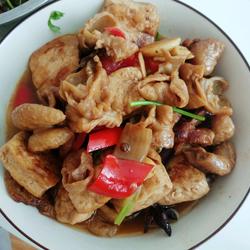 3.Add an appropriate amount of oil to the pot, add ginger slices, add the sausage, fry until the sausage turns slightly yellow, add aniseed, then gradually add garlic, onion, dried chili pepper, and red pepper and stir-fry until fragrant, then add Stir-fry the cooking wine, oyster sauce and dark soy sauce, then add the fried tofu.Stir-fry lightly, add an appropriate amount of boiling water, bring to a boil over high heat, then turn to low heat and simmer