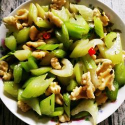 4. Stir-fry onion and garlic until fragrant, add celery, then add walnuts, stir-fry Stir-fry, add appropriate amount of salt (according to personal taste), add chili and stir-fry.