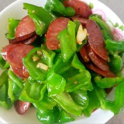 4. Heat the pot, add an appropriate amount of oil, add the prepared garlic and ginger, then add the chopped green pepper cubes and stir-fry, add an appropriate amount Salt, stir-fry until the flavors are fragrant, then add the sausage slices, stir-fry over high heat for 3 minutes and serve.