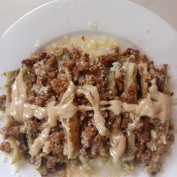 5. Sprinkle the fried minced meat on the eggplant, spread with peanut butter and enjoy.Doesn’t it look very appetizing?
