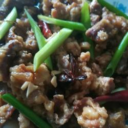 6. Put the fried meat into the pot and add the stock (if not, just add water, add chicken powder and add oil), add Sichuan peppercorns, chili and star anise A few drops of salt and soy sauce for coloring.(Bring to a boil over high heat, then reduce to low heat for more than 30 minutes or simmer for 15 minutes, then steam in a cage pot and add scallions to steam together)