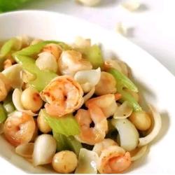 1. Wash the celery and cut it into thick slices with a diagonal knife; remove the shells from the shrimps and pick out the shrimp lines, marinate them with cooking wine for a while; slice the ginger; remove the stems from the lilies and wash them Clean, then peel into slices; add half a bowl of cold water to the starch to boil into water starch
