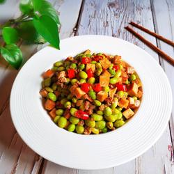 3. Dice the dried spiced beans and mince the large meat.Cut the red pepper into rings and dice the ginger.
