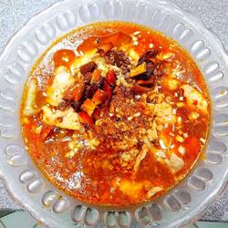 9.Place the cooked meat and soup with lettuce.In the bowl, sprinkle onions and garlic, and the previously stir-fried Sichuan peppercorns and chili peppers on top and then sprinkle with chili powder.
