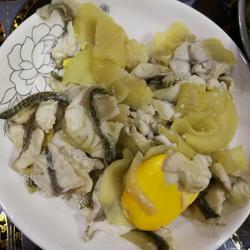 2. The fish head and belly are going to be boiled in porridge water, so the ginger is added.Instead of mincing ginger, add ginger, salt, oil, and egg white in the same order as in the first step.Then add two small spoons of cornstarch and mix well.