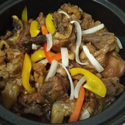 12. After the color changes, put it into the stew pot, add about half of the mushroom water (the water used to soak the mushrooms), bring to a boil over high heat, then turn to low heat, and cook for about an hour.Just use the juice