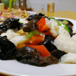 5. Heat oil in the pot, add onion and ginger and stir-fry together, add half a spoon Water, add a spoonful of salt, a spoonful of chicken powder, a spoonful of pepper, a spoonful of sugar, pour in cooking wine, change to low heat, add fish fillets, green and red peppers, fungus, pour in a small amount of water starch and sesame oil and stir-fry quickly for a few times Finally pour in the oil.