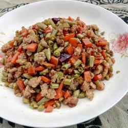 5.After the minced meat is cooked , add sour beans and carrots and stir-fry evenly, add some chicken essence and a little light soy sauce to taste