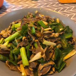5. Heat oil in a pot, add shredded ginger, green pepper and stir-fry for 1 minute, then add chicken gizzards and garlic leaves, add salt, light soy sauce, dark soy sauce, and stir-fry Laoganma! Add according to personal taste!