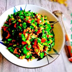 3. Cut chives, red cabbage peppers, and green peppers into small dices; mince pork Add soy sauce and cooking wine to the meat, mix well, and marinate for 15 minutes.